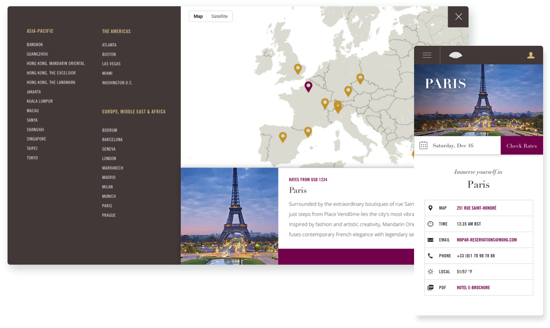 Mandarin Oriental Hotel Group, a luxury chain of 30+ hotels and resorts, was seeking a responsive redesign and a custom booking solution. Despite their high-profile celebrity guest list, site engagement was down and their mobile booking strategy was losing out on revenue. Additionally, their internal team struggled with the limitations of their CMS platform, unable to promote unique content and keep visual design consistent.